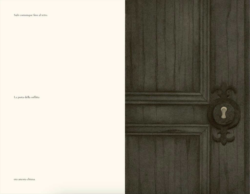 Spaventato, il suo amico lo cerca ovunque, anche in quella soffitta misteriosa dove lo aspetta una sorpresa: sul vetro della finestra impronte di bambini e un nome che è un saluto. Una traccia sullo sporco, una scritta che lascia un messaggio potente.
