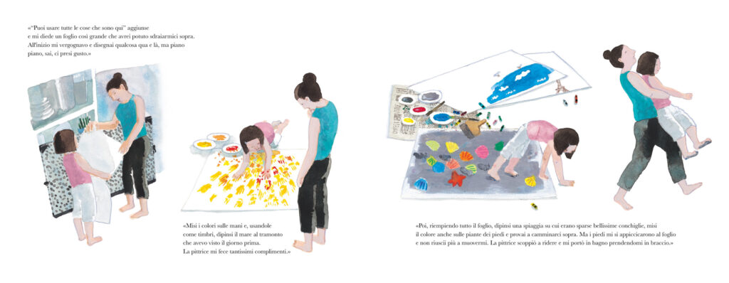 Il racconto di formazione, che lascia a bocca aperta, fa sognare e perdersi, ispirato da un ricordo d’infanzia dell’autrice (“da bambina imparai a dipingere da una pittrice che abitava vicino a casa mia… fu il primo adulto a non trattarmi come una bambina”, scrive), evoca l’atmosfera di un momento speciale e fuori dall’ordinario e, attraverso tavole dettagliate e colte, sottolinea il potere salvifico dell’arte. Sempre. Con le mani intinte e perse nelle tonalità più svariate, con le dita e le piante dei piedi che riempiono fogli. Dando forma e colore a ciò che si è visto con il cuore. Meraviglioso. Unico.