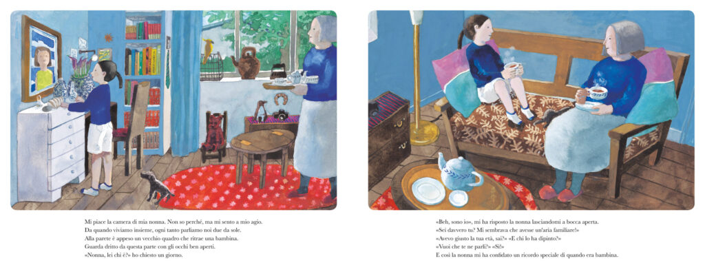 Una nonna condivide con la nipotina un ricordo prezioso e speciale della sua infanzia, partendo da un quadro appeso alla parete che la ritrae da bambina. Una settimana d’estate passata nello studio di una pittrice che abitava da sola in una casa dal soffitto alto in riva a mare, una vecchia amica della madre assorbita dalle sue tele e colori; una settimana in cui aveva dipinto molto giocherellando con gli acquerelli, plasmato argilla, letto una montagna di albi illustrati e di libri di pittura, giocato con il gatto, dormito in un comodo letto cigolante, ascoltato il frinire degli insetti e tanta musica, guardato il mondo a testa in giù, come in una danza, passeggiato lungo la riva del mare a guardare le onde e le conchiglie e a sentire l’odore delle alghe, scoperto l’arte e liberato la creatività. Senza più fogli bianchi. Senza un solo minuto di noia.