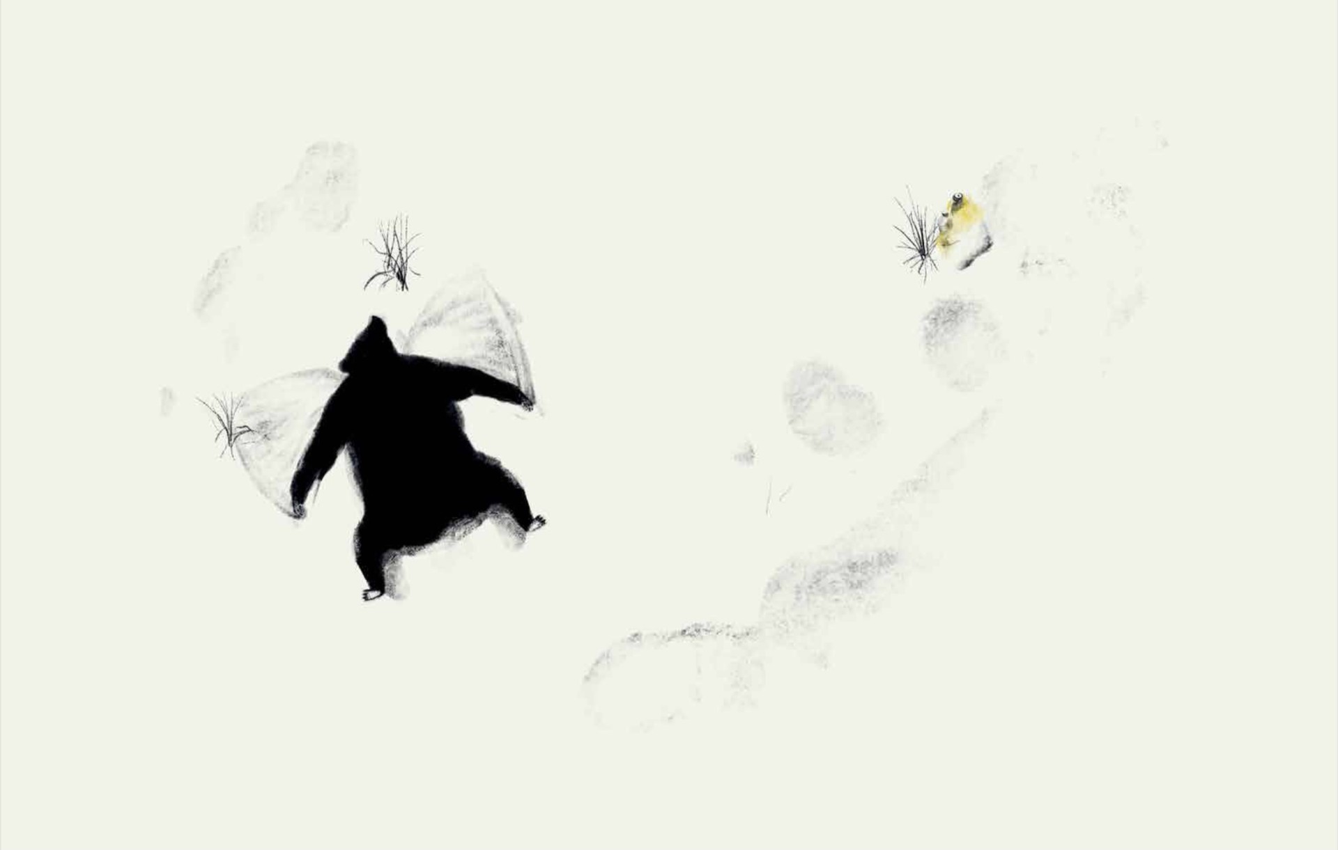 Senza il noioso – e per lui inutile letargo (perché mai perdersi tanta bellezza?) – può trotterellare per terre sterminate, entrare in relazione con un cervo, con un pupazzo di neve, con l’aria frizzantina, con un albero gigante e con molti altri esseri, animati e non, che incontra al suo passaggio. C’è però un’unica specie con cui non vuole davvero avere contatti, visto come si comporta, e siamo noi.