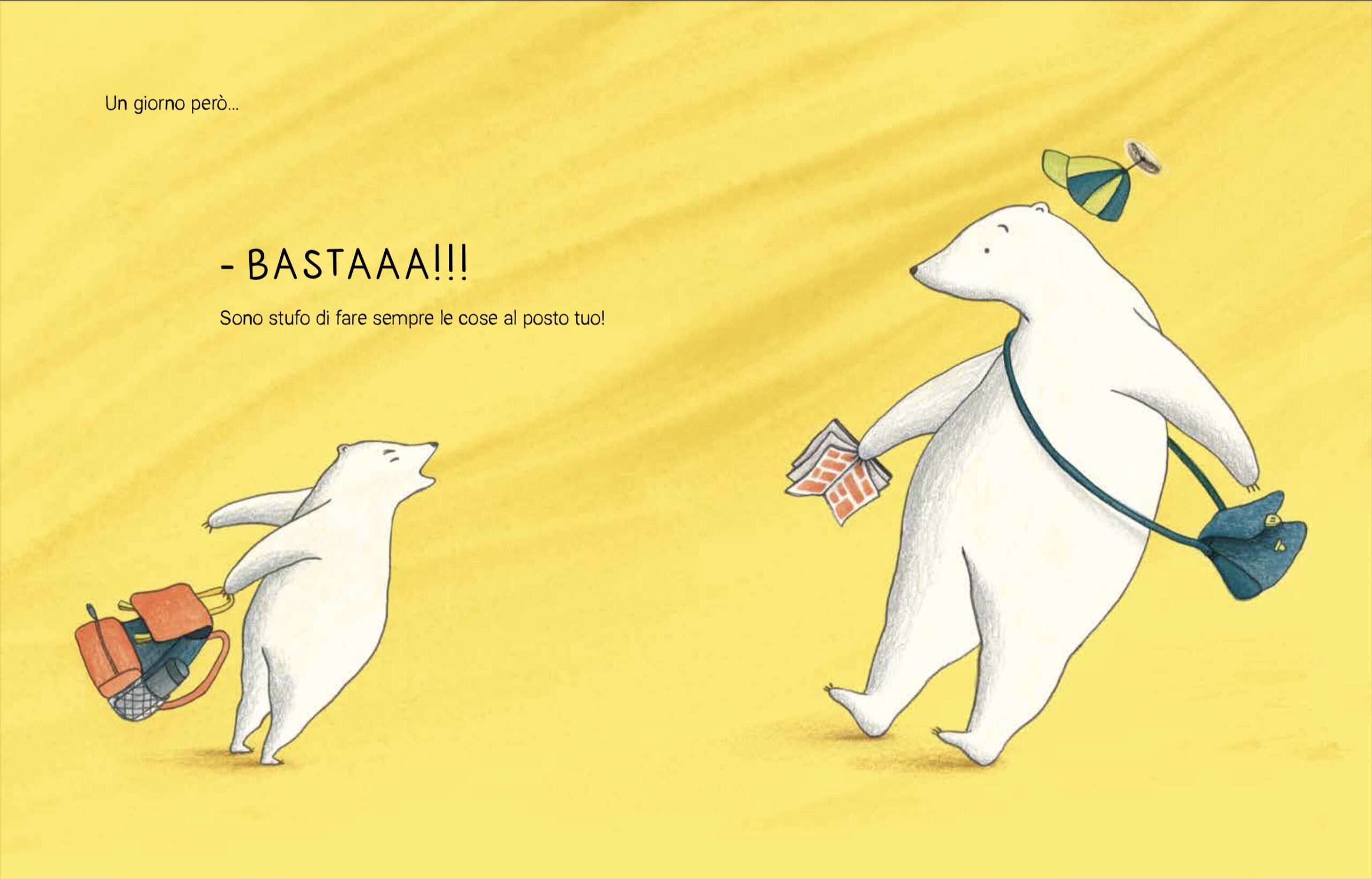 Se poi ci sono da fare i biglietti per viaggiare, tocca sempre a orso piccolo occuparsene. Le file sono una scocciatura. Il grande dice di non essere capace ad usare le macchinette, ma è solo pigro e abituato a farsi servire e ubbidire. La parola fatica non fa parte del suo limitato vocabolario.