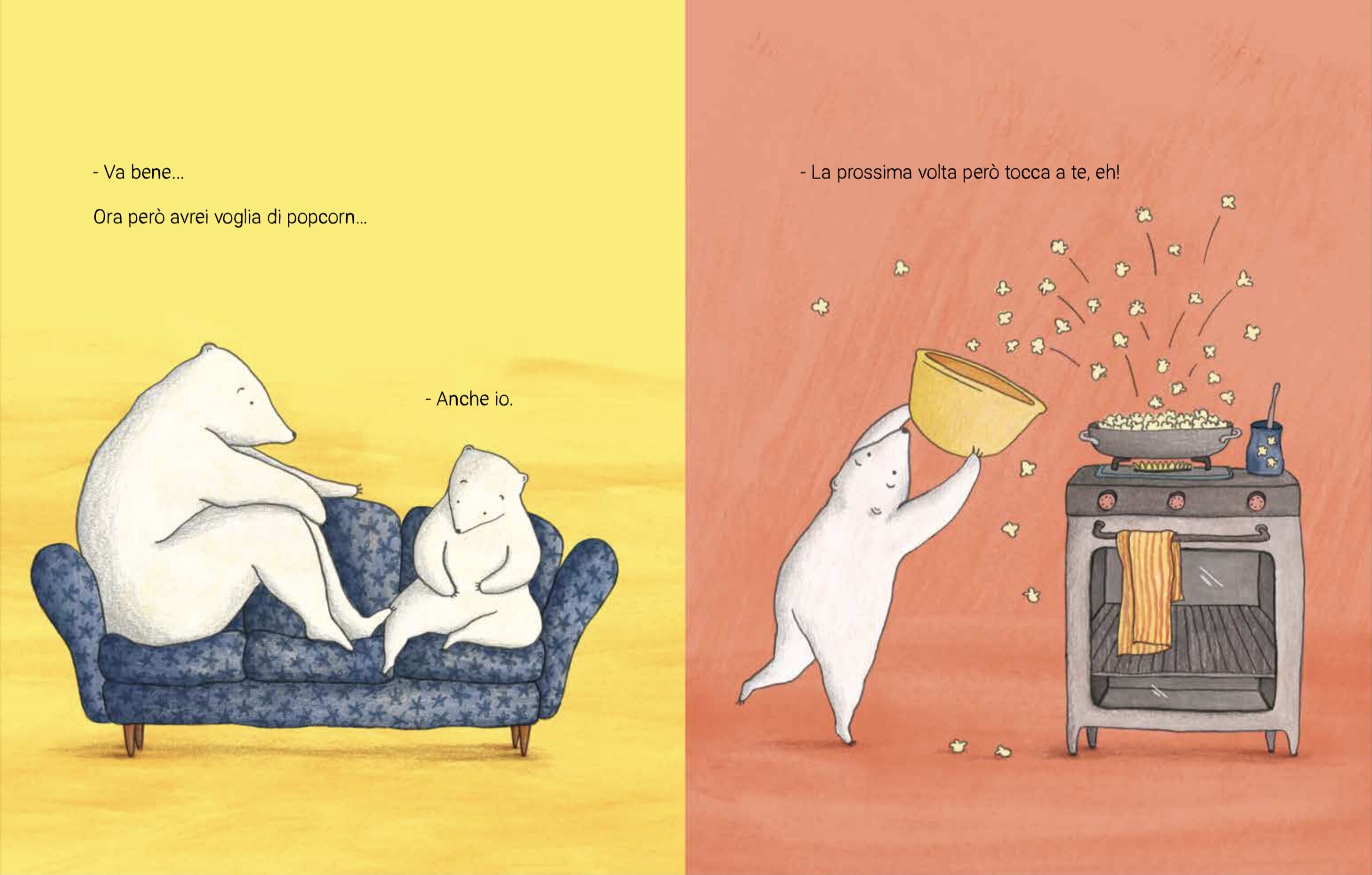 Orso piccolo esegue sempre ciò che il grande gli chiede, ma un giorno si accorge di essersi davvero stancato e dice ad orso grande di fare lui. A volte basta spostarsi un po’ per trovare nuovi ed impensabili equilibri. Si può fare, in fondo, a turno. Un poco per tutti. Non sempre funziona, ma vale la pena provarci.