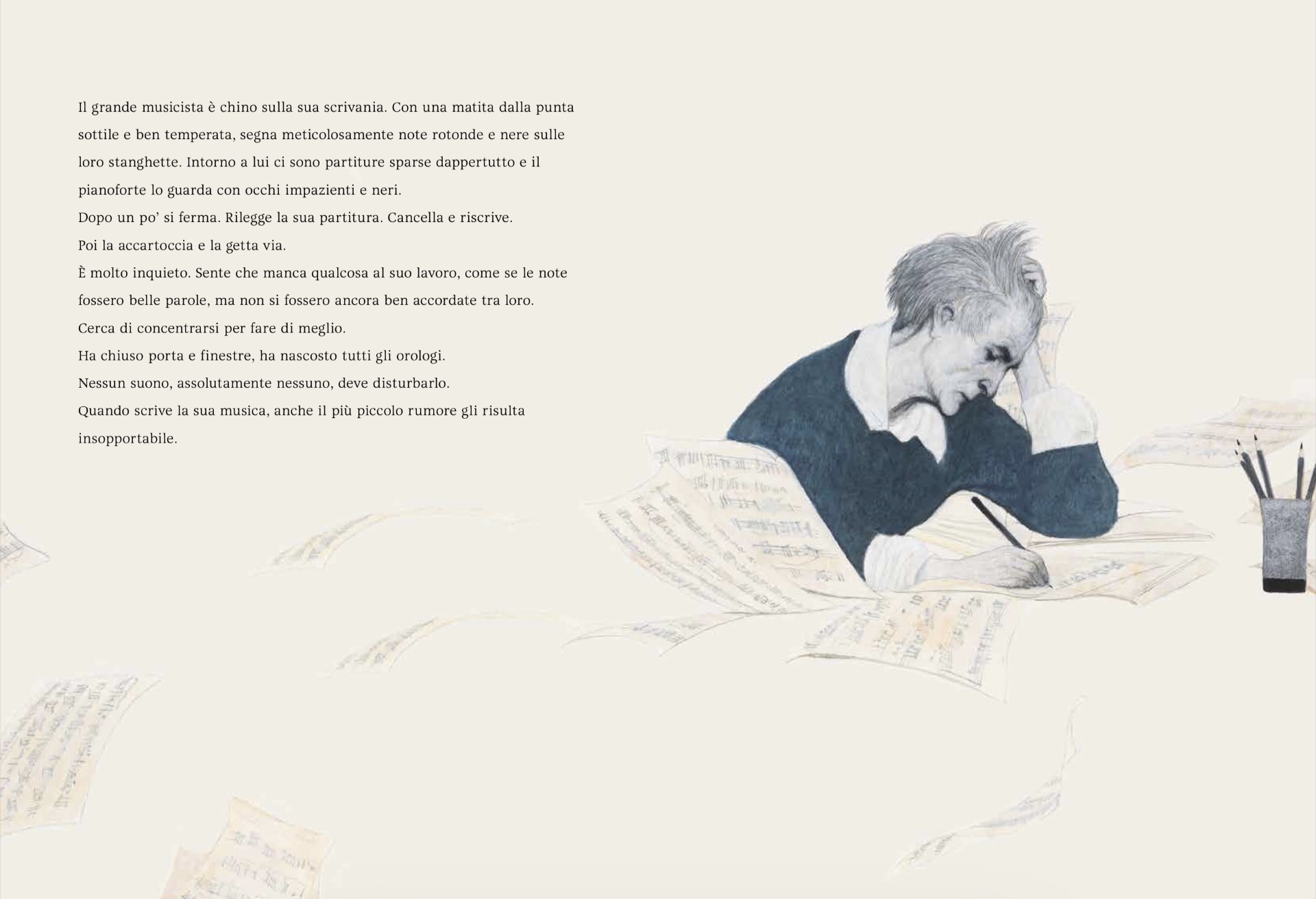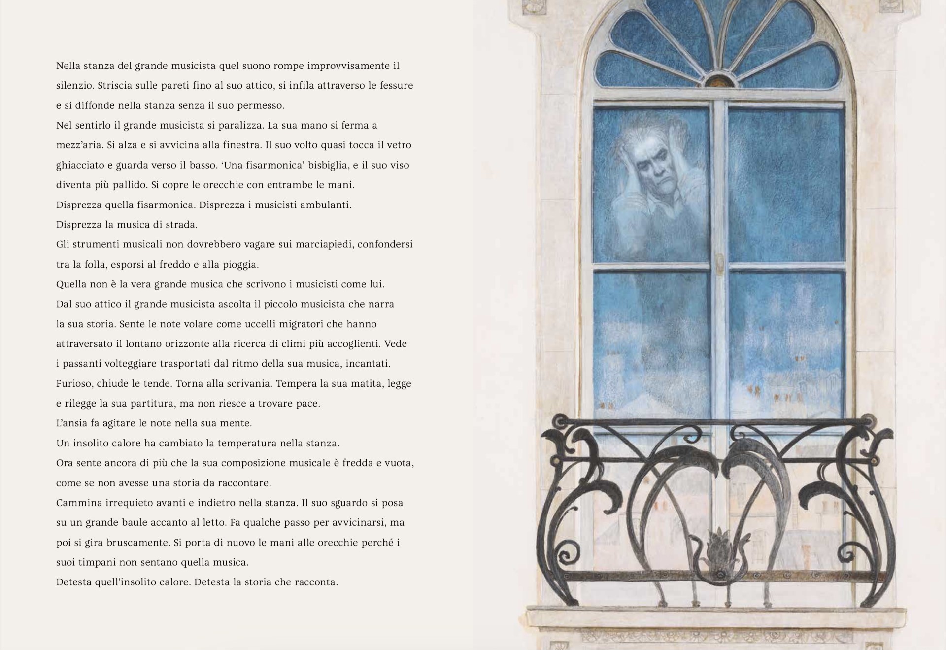 Gli ambulanti, che piaga, che onta! Se poi disturbano la sua concertazione mentre cerca di creare, fra mille fogli sparsi e note, la sua importante composizione, il dramma è completo. Che fastidio, che insofferenza. Ma quel bambino narra la sua storia e le note volano come uccelli migratori che hanno attraversato il lontano orizzonte alla ricerca di climi più accoglienti. I passanti sono attirati e trasportati dal ritmo della musica, incantati. Volteggiano. Mentre la sua musica gli appare fredda e vuota e l’ansia sale.