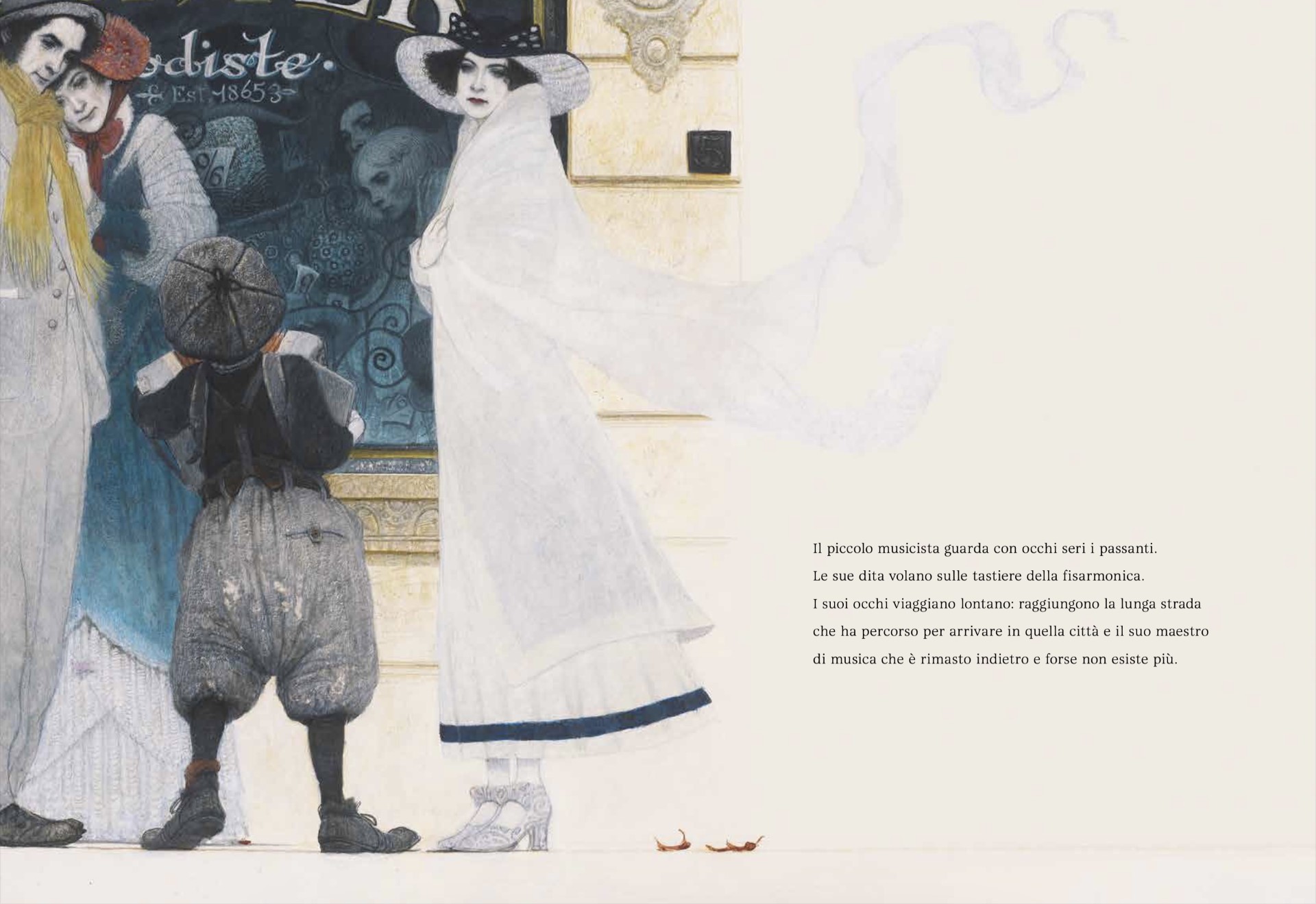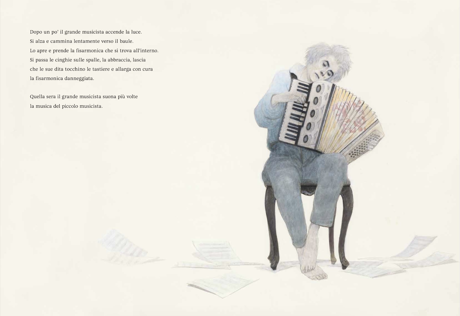 La notte, però, un sogno terribile lo sveglia. Si alza e prende la fisarmonica dal baule, l’abbraccia e suona la musica del piccolo musicista. Sì, proprio quella.
