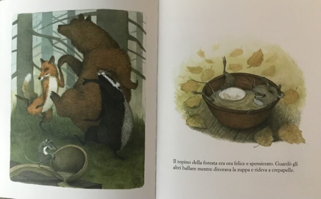 È arrivato l’autunno e gli animali della foresta hanno passato l’intera giornata a raccogliere funghi. Lunghe camminate nel verde che sa di muschio. Il tasso, la lepre, la volpe ne trascinano cesti stracolmi con cui prepareranno una deliziosa zuppa e faranno una grande festa. Sono esausti e sfiniti ma tutti molto felici. Tutti tranne il topino, che, mogio mogio, è di cattivo umore fin dalla mattina (ha davvero la luna storta) e ora, seduto in cima alla montagna di funghi che trasporta l’orso, chiede di scendere a terra e abbandona la comitiva. Non ha voglia di festeggiare né tantomeno di preparare una zuppa, anzi, lui è l’unico così piccolo da non aver raccolto nemmeno un fungo e adesso che è rimasto solo e si guarda intorno nell’immensità della foresta si sente una vera nullità. Finché non nota le foglie che cadono leggere dagli alberi e che il vento fa volare tutt’intorno. La foresta è davvero bella!