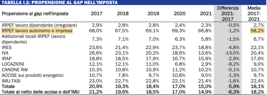 Quelle sul reddito sono pagate per l’83% da pensionati e dipendenti (che non possono evadere in quanto hanno una trattenuta alla fonte), mentre i 5,8 milioni di lavoratori autonomi hanno un’altissima evasione stimata al 68% di quanto dovrebbero dichiarare: su 100 euro ne dichiarano in media 32 (fonte Agenzia delle Entrate, vedi la tabella sottostante)