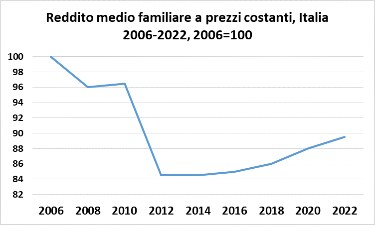 L’indagine sulle famiglie italiane[1] della Banca d’Italia appena uscita con i dati relativi al 2022, mostra un paese impoverito. Nessuno di noi nei gloriosi anni ’70, ispirati dall’idea di progresso, si sarebbe mai aspettato che ci saremmo trovati in condizioni così pessime, non solo per i soldi ma per tutto il resto (che in questo articolo lasciamo perdere perché parliamo solo di soldi). Recita trionfalmente lo studio: “il reddito medio annuo familiare e quello equivalente sono cresciuti in termini reali dell’1,4 e 1,8% rispetto al 2020”, ma poi sommessamente deve aggiungere: “anche se risultano ancora inferiori a quelli osservati nel 2006 prima della crisi finanziaria globale (del 10% e 5%, rispettivamente)”.