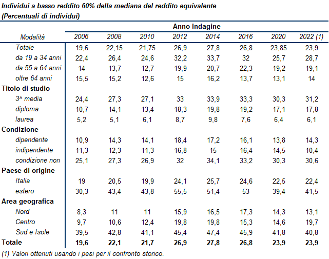 Per la povertà relativa usiamo alcuni dati relativi agli individui a basso reddito, pari al 60% della mediana in serie storica. Come si vede nella tabella allegata crescono dal 19,6% del 2006 al 23,9% del 2022, in lieve calo rispetto al periodo 2012-2016 (26,9%) nel quale si era dispiegata la recessione italiana dopo il 2008. Il dato sale al 41,5% per gli stranieri ma rimane alto anche per gli italiani (22,4% e in crescita sul 2006). E’ più basso al Nord (14,3%) ma è quasi raddoppiato rispetto al 2006, in quanto probabilmente include molti stranieri che hanno lavori stagionali e precari, di cui il Nord ha sempre più bisogno.