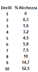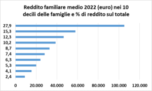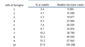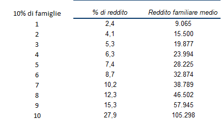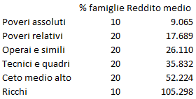 Analizzando la distribuzione delle famiglie per decili vediamo che il 10% delle famiglie più povere (1° decile) guadagna in media 9mila euro all’anno (sono quelle che Istat classifica come poveri assoluti che sono appunto il 9,7% delle famiglie italiane), seguite da quelle che guadagnano 15.500 euro e dal 3° decile che guadagna 19.877 euro. Queste ultime famiglie sono di fatto i poveri relativi (23% delle famiglie dice Istat) che assieme ai poveri assoluti formano il terzo più povero degli italiani che guadagnano da 9mila euro (stiamo parlando di famiglie non di singoli) a poco più di 19mila euro. Poi segue il 10% delle famiglie operaie che guadagnano 24mila euro seguiti da un ceto assimilabile agli operai (insegnanti, etc.) che prendono 28.225 euro. Siamo sempre a livelli modesti anche col 6° e 7° decile, che guadagna rispettivamente 32.874 euro e 38.789. Bisogna far parte dell’ 8° decile per guadagnare 46.502 euro e del 9° per avere 57.945 euro. E’ il nostro ceto medio impoverito, come del resto è avvenuto per tutti gli altri. Solo il 10° decile può dirsi ricco, quello del 10% delle famiglie che guadagnano 105.298 euro in media all’anno e che detengono il 28% del reddito nazionale.