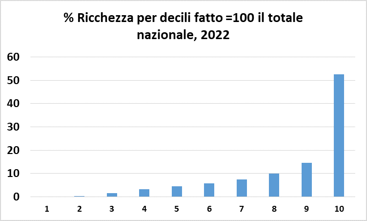 Se si considera invece solo il patrimonio finanziario (azioni, obbligazioni, depositi bancari) il 10% più ricco detiene i 2/3 (64%) di tutta la ricchezza finanziaria, il 2° decile più ricco il 12,1%, il 3° decile il 7,1%. In sostanza il 20% più ricco detiene il 76,1% e il 30% più ricco 83,2%, mentre il restante 70% degli italiani possiede il 16,8%. Il gruppo dei più ricchi si è difeso meglio dall’inflazione in quanto i rendimenti finanziari (gestiti da banche e fondi specializzati) hanno reso negli ultimi 3-4 anni più dell’inflazione.