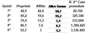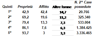 [9] 94% nel quinto delle famiglie più ricche, 86% nel 4° quinto, 79% nel 3° quinto e 69% nel 2°. Solo il 1° quinto (20%) delle famiglie più povere scende al 43% come proprietari di casa.