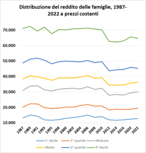 Questa figura evidenzia in un’ottica di lungo periodo (1987-2022) i redditi delle famiglie di alcuni decili (suggeriti dalla Banca d’Italia). Le due linee più alte sono il 9° decile (quello appena sotto i ricchi che stanno al 10°) che rappresenta il ceto medio alto e il 3° quartile (ceto medio), entrambi in caduta. Seguono media e mediana, mentre le due linee più basse sono il 1° quartile e il 1° decile, in lieve ripresa ma sotto i livelli del 1989 e del primo decennio del 2000.