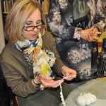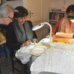 C’è un’atmosfera serena, rilassata e allegra al corso, si percepisce. Mentre Maggiolina racconta dell’arte del ricamo e del suo progetto, le signore procedono ognuna col proprio lavoro partecipando di tanto in tanto alla conversazione, ma alla domanda “Che cos’è per voi il ricamo?”, non resistono e si scatenano: per Margherita, insegnante garbata e gentile, il ricamo “è la scoperta della manualità, la gratificazione di realizzare con le mie mani un lavoro finito” e – aggiunge – “questo è il mio appuntamento settimanale, il mio momento di totale relax, è un’attività che mi rilassa e mi gratifica insieme.” Caterina annuisce e con soddisfazione aggiunge: “Grazie a Maggiolina ho imparato a riconoscere i tessuti di qualità, prima mi sembravano tutti belli, ora ho un occhio diverso e li distinguo. Lei ha una grande conoscenza delle stoffe e dei materiali e sa dove procurarsi i migliori.” Franca, una simpatica signora dall’accento romagnolo, dice: “Ho sempre pensato che ci potesse essere un paragone tra la pittura del Seicento e il ricamo, per l’attenzione al particolare, per la finezza. E Maggiolina è una bravissima insegnante che ci risolve ogni problema: se ci ingarbugliamo e ci vengono dei nodini, lei arriva e li scioglie, ci aiuta e ci indica come proseguire, con semplicità. È dolce e ha una grande pazienza, e questo ci mette molto a nostro agio, stiamo benissimo con lei.”