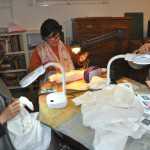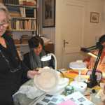 “Sto innanzitutto cercando un luogo idoneo, ma purtroppo per ora non ho incontrato molto interesse e disponibilità, e il motivo è molto semplice: non si riconosce più il valore dei manufatti di qualità, e quando parlo ai miei interlocutori di pizzi e ricami mi rendo conto che le persone pensano alle presine e ai centrini. Ho l’impressione che non siano apprezzati perché sono lavori dimenticati. E pensare che attività come queste sarebbero una risorsa economica importantissima per la città; basti pensare che nel passato intere città sono state salvate dalle donne quando i loro uomini perdevano il lavoro; parliamo di Burano, parliamo del Trentino in seguito alla chiusura delle miniere, ecc. Per ora ci troviamo nel retro di quello che prima era il mio negozio di libri e stiamo benissimo (oltre a ricamare Maggiolina ha gestito dal 1978 la Libreria Antiquaria Victor di p.tta Corelli), ci piace molto lavorare in mezzo ai libri, ma siamo un po’ sacrificate e, nel momento in cui dovessimo iniziare a lavorare sul serio, occorrerebbe uno spazio più grande e attrezzato.”