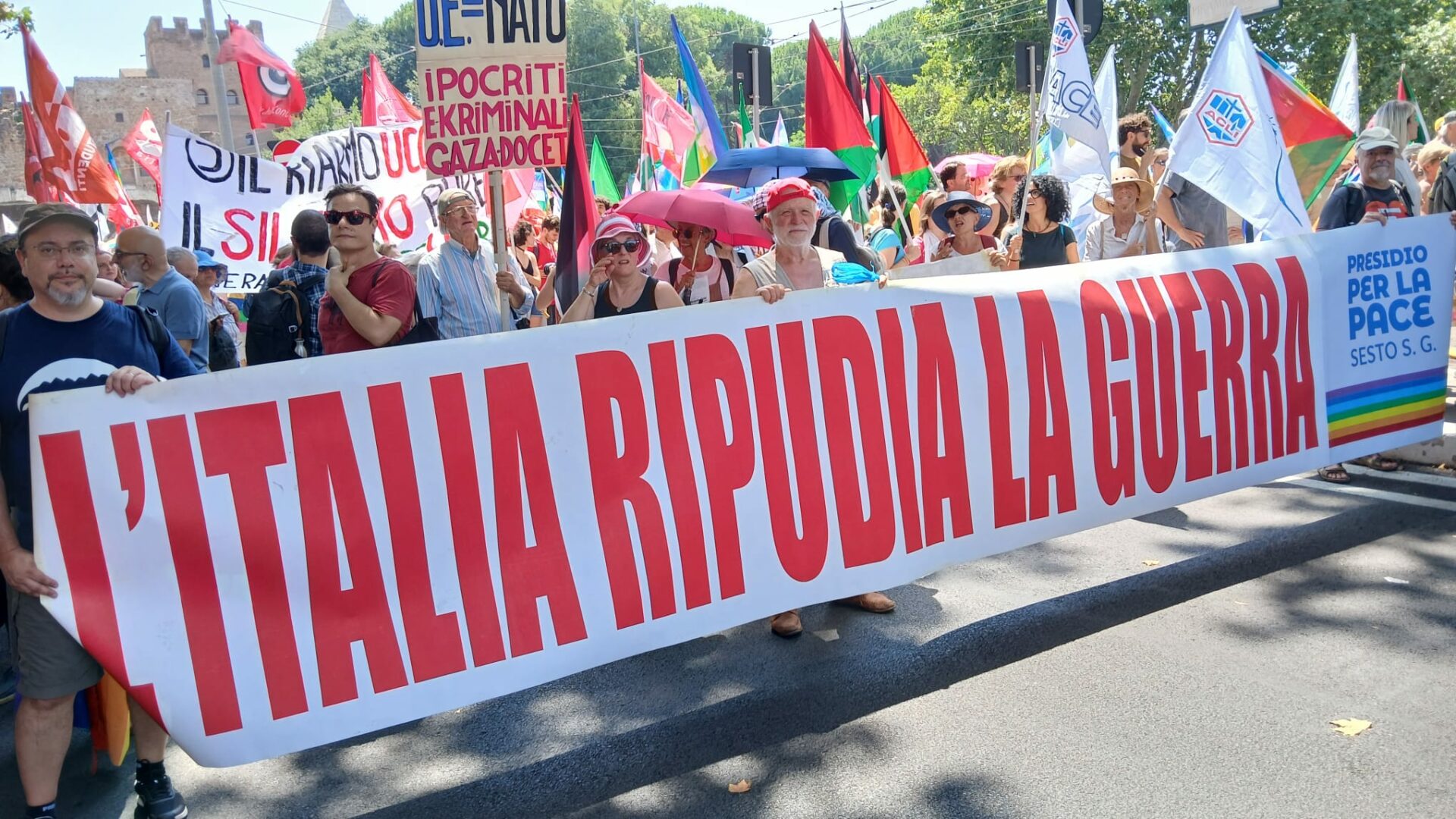 Striscione a una manifestazione pacifista, Italia ripudia la guerra – foto di Roberto Zanotto