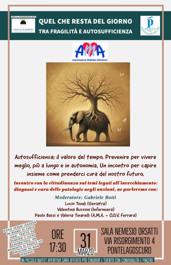 Il 31 Marzo 2025 ore 17.30 alla Proloco di Pontelagoscuro, presso la Sala Nemesio Orsatti di Via Risorgimento 4, si parlerà di senilità e patologie legate all’età.