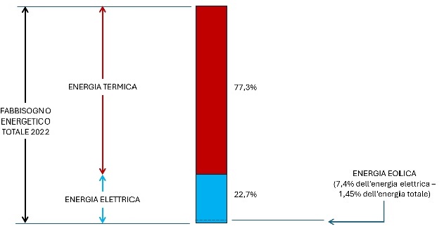 Come sappiamo, gli impianti eolici producono solo energia elettrica. Questo ridimensiona moltissimo il contributo dell’eolico nel soddisfare il fabbisogno energetico italiano: se consideriamo il totale dell’energia consumata (elettrica + termica), il contributo dell’eolico si ottiene moltiplicando le due percentuali appena viste, cioè 7,4% x 22,7% = 1,45%.