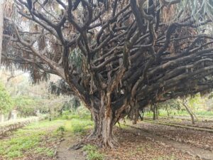 Passarci sotto mette davvero inquietudine, con quei rami scuri e grifagni. Le sue propaggini sono nere come membra mostruose, che sembrano allungare inquietanti, piccole manine verso il basso e verso chi osa passarci sotto. Rasserena scorgere il passaggio di una più tranquillizzante e comune gallina, dalle piume rossastre, che becchetta lì intorno.