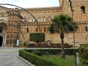 Bella come un centrotavola monumentale la palma a sei zampe del Chiostro dei Benedettini, che affianca il Duomo di Monreale. Una proliferazione di tronchi, che si moltiplica nelle variegate colonne – tutte diverse – che circondano l’area verde.