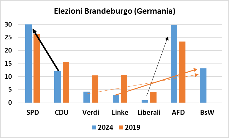 Le elezioni nel Brandeburgo, la più ricca regione della Germania Est, vedono SPD crescere di 4 punti rispetto alle elezioni regionali del 2019 e rimanere il primo partito, nonostante la crescita di 6 punti dell’estrema destra AFD. A ben vedere però è una vittoria dell’attuale Governatore Spd Woidke (molto amato) che, nella polarizzazione tra Spd e AFD, ha sottratto voti agli altri partiti (CDU inclusa), tranne al nuovo partito di Sahra Wagenknecht (13,1%) che sorpassa anche la CDU. Nel complesso l’estrema destra Afd e l’estrema sinistra (BsW) crescono dal 23% del 2019 al 43% del 2024 (quasi raddoppiano), confermando il trend di tutta la Germania che fa tremare i partiti tradizionali per le elezioni nazionali del 2025.