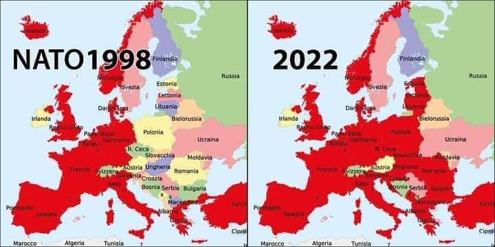 Sorpresa. La macchia scarlatta che si è dilatata verso est negli ultimi 24 anni è rossa, ma non è russa. E’ la Nato. Ed è già da aggiornare perchè quella nazione color magenta in alto a destra, la Finlandia, è diventata rossa pure lei. Conosco l’obiezione: la Nato non obbliga nessuno Stato all’adesione. Ma la Nato è un’organizzazione del libero commercio? Un ente filantropico? Un enorme Rotary Club in cui i notabili della Terra si riuniscono per fare il bene dei loro cittadini più sfortunati?