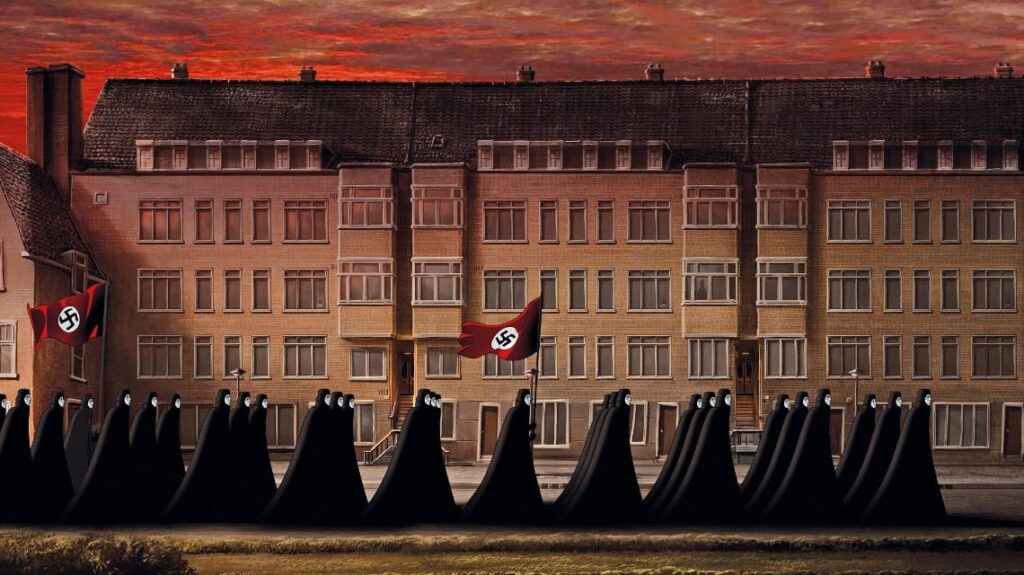 “La scena in cui la famiglia di Anna Frank arriva ad Auschwitz è stata la più difficile del film”, dice il regista. “Come mostrare un momento così delicato e peculiare della storia ai bambini di 10 o 11 anni?” Era necessario fare una scelta saggia. Alla fine, ho trovato diversi parallelismi tra i campi di sterminio dei nazisti e gli Inferi della mitologia greca. Anna Frank era appassionata di mitologia greca. I nazisti avevano treni e mezzi di trasporto, selezionavano le loro vittime e avevano creato campi di sterminio. Nella mitologia che Anna Frank amava, non c’erano treni ma barche e i personaggi non circolavano sulla terraferma ma sui fiumi. Anche Ade, il dio degli Inferi, faceva delle selezioni… e aveva i cani, proprio come i cani che i nazisti mettevano vicino ai binari della ferrovia che portavano ai campi. Mi sono detto che con immagini evocanti questi eventi – e ispirate dalla mitologia greca – unite a commenti relativi alla deportazione della famiglia di Anna Frank avremmo potuto sensibilizzare il pubblico più giovane”. Dentro e dietro le divise delle SS non ci sono lineamenti perché il Male è disumano e oscuro. Non ha volto.