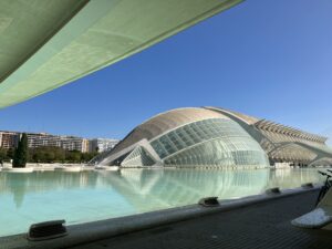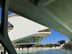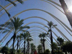 La passeggiata, rallegrata dalla vista di tantissimi Valenciani a piedi, in bici, famiglie con bimbi festanti, ci fa ammirare la “cupola” di vetro del Palau de la Música costruito su progetto di José María Paredes nel 1987 e ci conduce, uno dopo l’altro, ai capolavori di Calatrava: la Città delle Arti, concepita sul tema della natura e dell’acqua e dominata, all’ingresso, dal giardino sospeso dell’Umbracle i cui 55 archi evocano le lische di un pesce; l’Hemisfèric, il cinema detto “l’occhio” che riflette in una vasca la sua semisfera contornata da una “palpebra” in metallo; il Museo delle Scienze “Principe Felipe”, un edificio che assomiglia a una colonna vertebrale e che accoglie un museo interattivo su tre livelli.