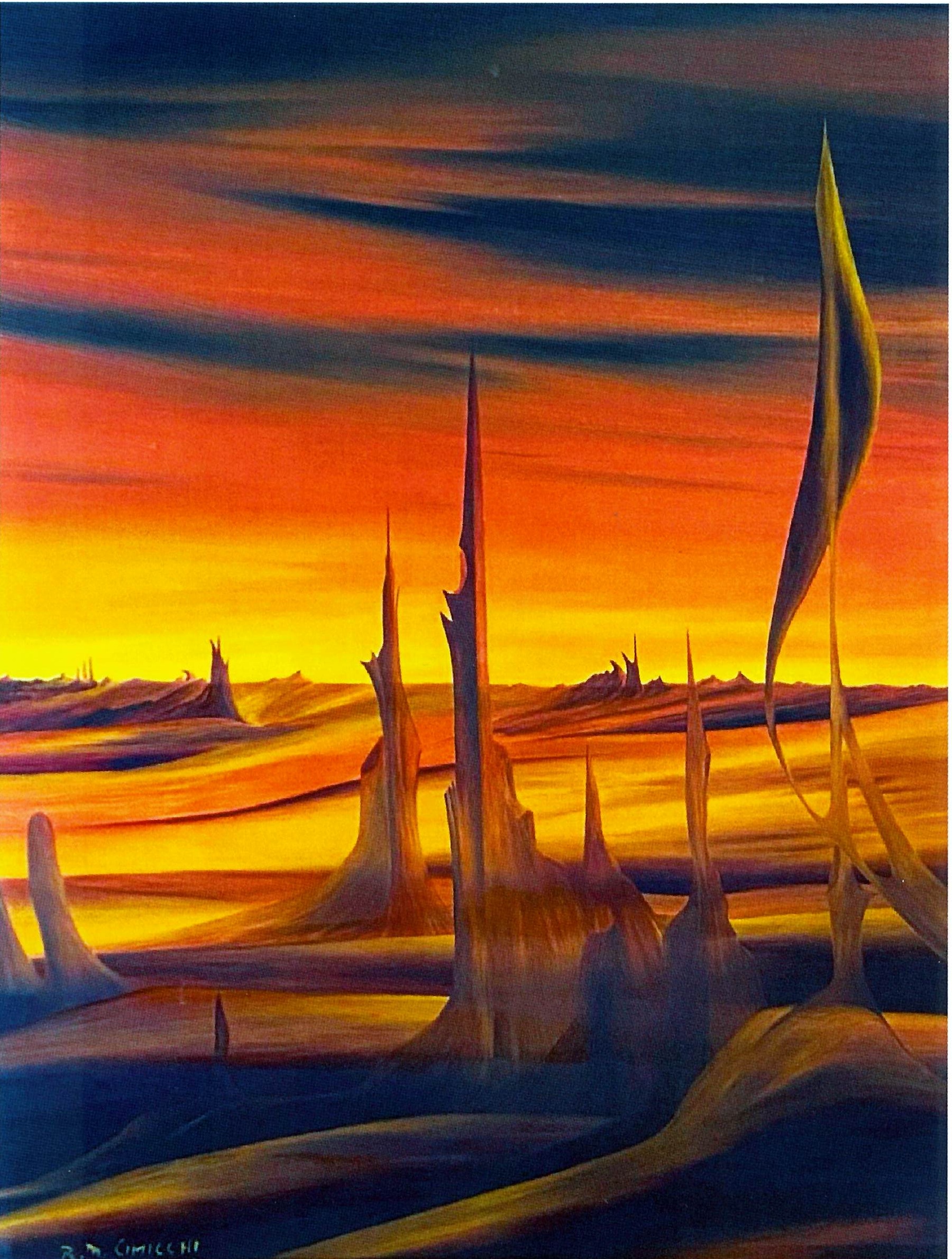 Protagonista principale delle opere esposte è Rolando Maria Cimicchi (1924-1979). Definito nel catalogo come “artista di complessa personalità”, Cimicchi è pittore che “a lungo fra noi fu vero ‘poeta surreale’, a cominciare dalla sua esistenza inquieta, che lo portò a vivere a Parigi (dove studiò direttamente le opere di Breton), Africa, Mato Grosso, Tibet”.