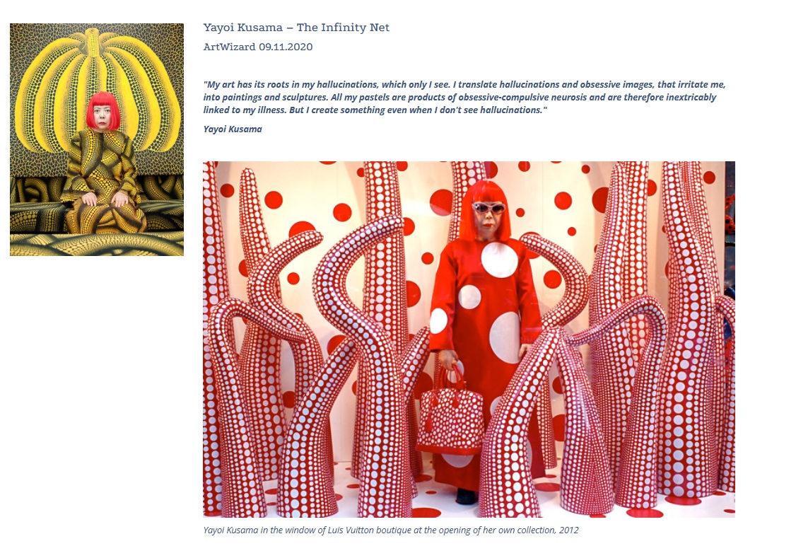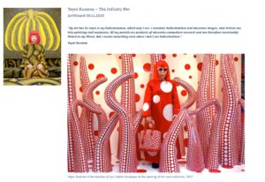 Un tema che oggi evoca le opere di un’artista in vetta alla scena dell’arte contemporanea internazionale, quale Yayoi Kusama (giapponese, classe 1929), nota per l’uso dei pois nei suoi lavori, che spesso si trasformano in installazioni colorate dalle forme insolite che trasportano il visitatore in mondi surreali come Infinity Mirror Room e Phallic’s Field.
