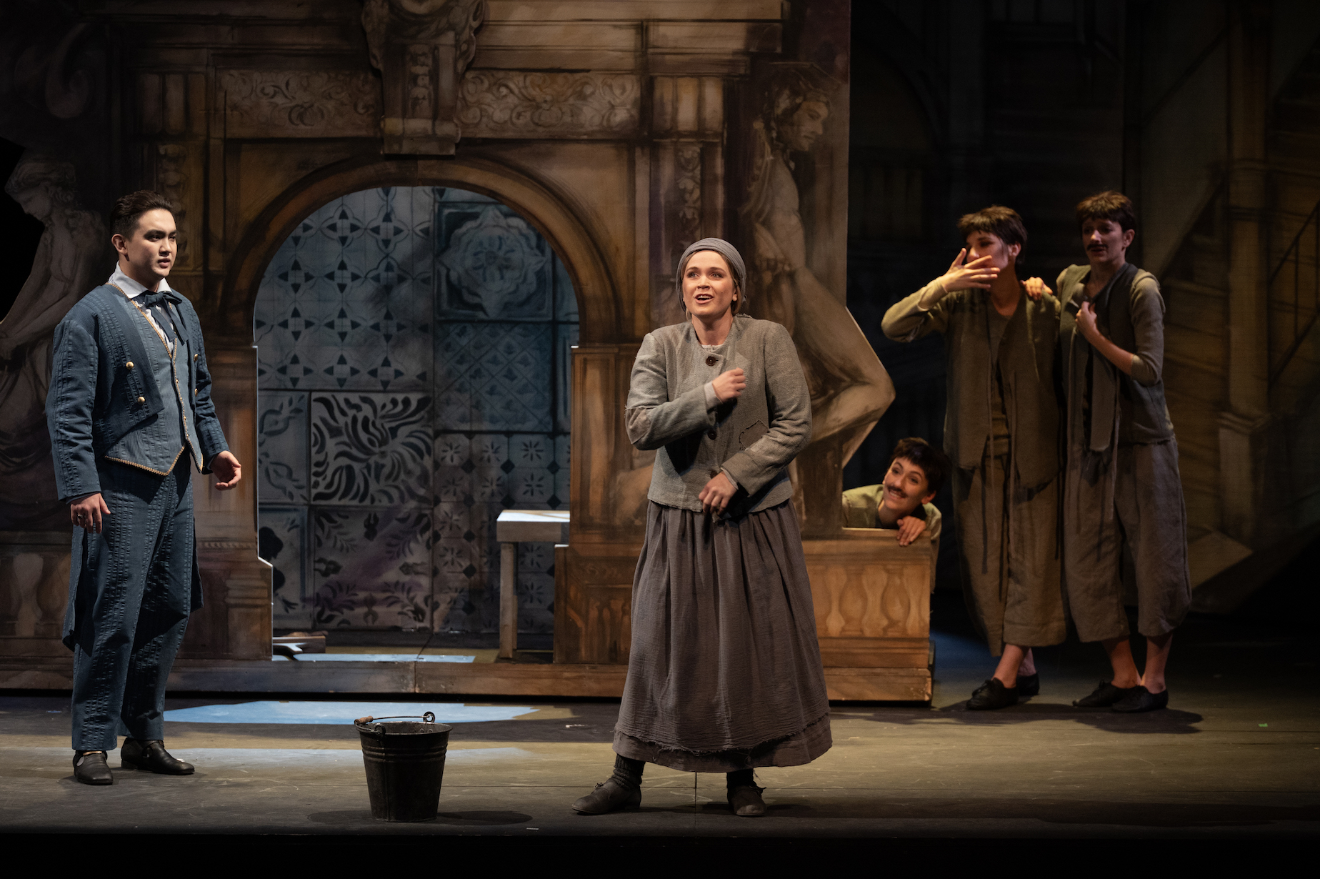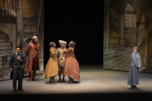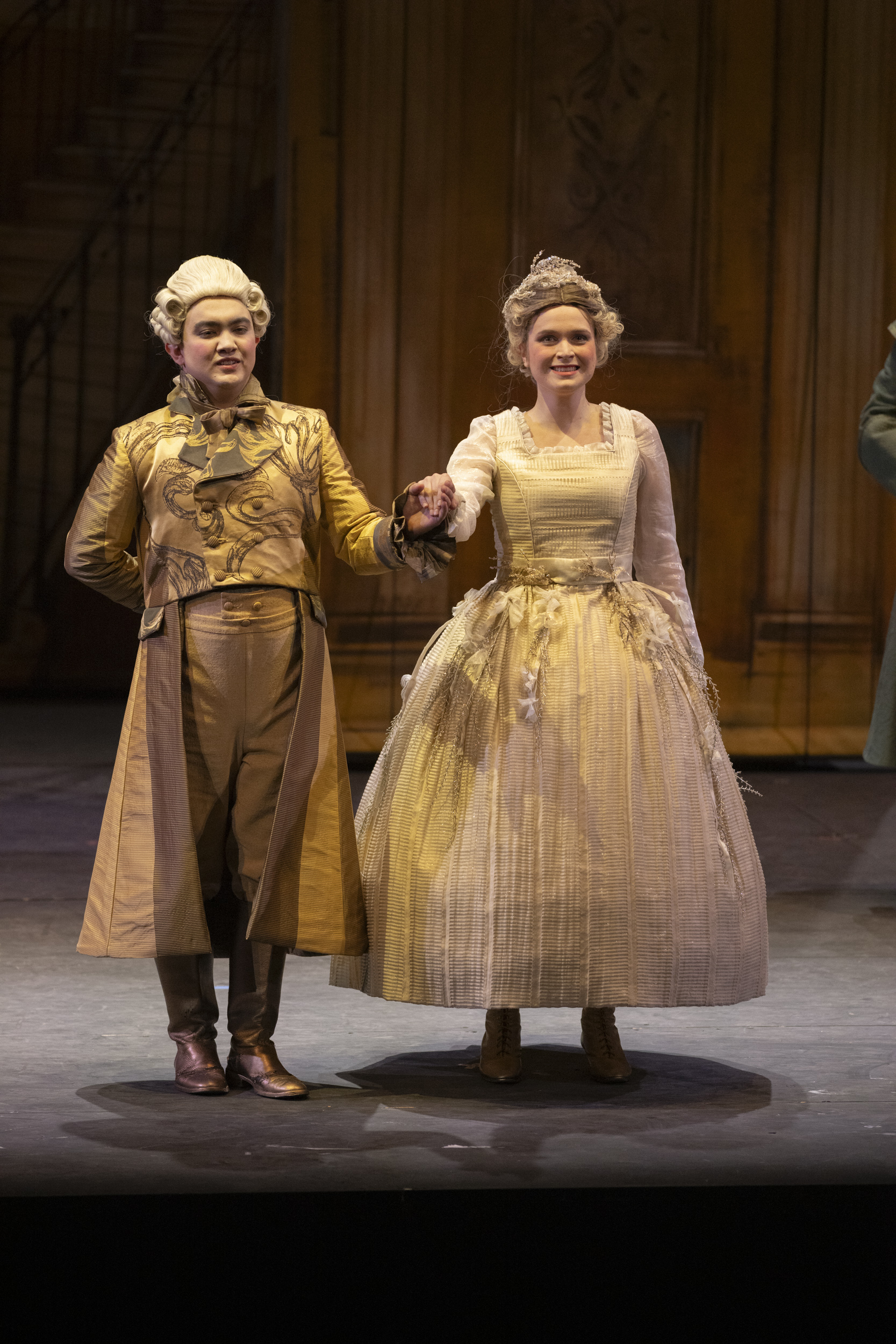 Nell’opera rossiniana la fanciulla viene scoperta dal principe in anonimato, con il suo paggio sotto mentite spoglie di mendicante che chiede carità e viene assecondato solo da lei, Cenerentola attenta e generosa a dispetto degli abiti coperti di cenere. E anche alla fine, l’abbraccio domestico tra eroina e principe avviene con i costumi cinerei di Rosanna Monti, composti da una spartana giacchina e gonna dello stesso tono grigio. Una visione etica che pone al centro autenticità e positività come forze capaci di trasformare il destino. Privata degli elementi magici, l’opera attribuisce ogni svolta all’agire umano, alle scelte morali e alla rivincita del perdono sulla rivalsa. Una narrazione che trasmette un messaggio di valore quasi filosofico e invita a credere nella forza silenziosa di altruismo, semplicità, mitezza, ma anche risolutezza. E quella di Cenerentola si delinea come una personalità consapevole dei propri valori, priva di ostentazione e orgogliosa della propria equilibrata rettitudine.