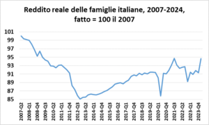 Esulta il Governo, perché l’Ocse dichiara che i redditi reali delle famiglie (media per abitante) in Italia sono cresciuti nel 1° trimestre del 2024 più che in tutta Europa e Usa (+3,4% a fronte di una media Ocse di +0,9%). Ma è lo stesso Ocse a ricordare che siamo ancora sotto del 5,4% rispetto al livello raggiunto nel 2007 prima della grande recessione, mentre tutti gli altri Paesi sono già ritornati sopra. Gli andamenti dell’economia sono significativi considerando almeno un anno sull’altro (non un trimestre sull’altro); inoltre bisognerebbe non dividere il reddito generato in modo piatto tra tutti gli abitanti (ottenendo la media del pollo di Trilussa), ma considerando chi ha avuto forti incrementi (e sappiamo chi sono, i ricchi e super ricchi) e chi invece (poveri, operai, ceto medio) non ha avuto aumenti reali post inflazione.