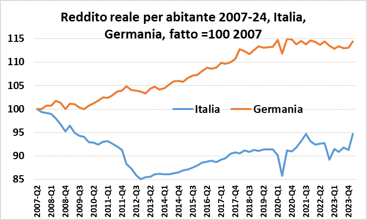 Il confronto con la Germania fa capire quanto reddito abbiano perso gli italiani dal 2007 ad oggi. Ben venga l’aumento del 1° trimestre 2024, dovuto anche agli ingenti investimenti del PNRR (che non ci saranno più dal 2028). Il problema sono gli investimenti strutturali, che mancano in Italia. Ma quando le cose vanno bene per le imprese come per banche, assicurazioni, imprese energetiche, (lauti ricavi e ancor più lauti profitti), c’è una gran corsa a distribuire i dividendi agli azionisti più che ad investire.