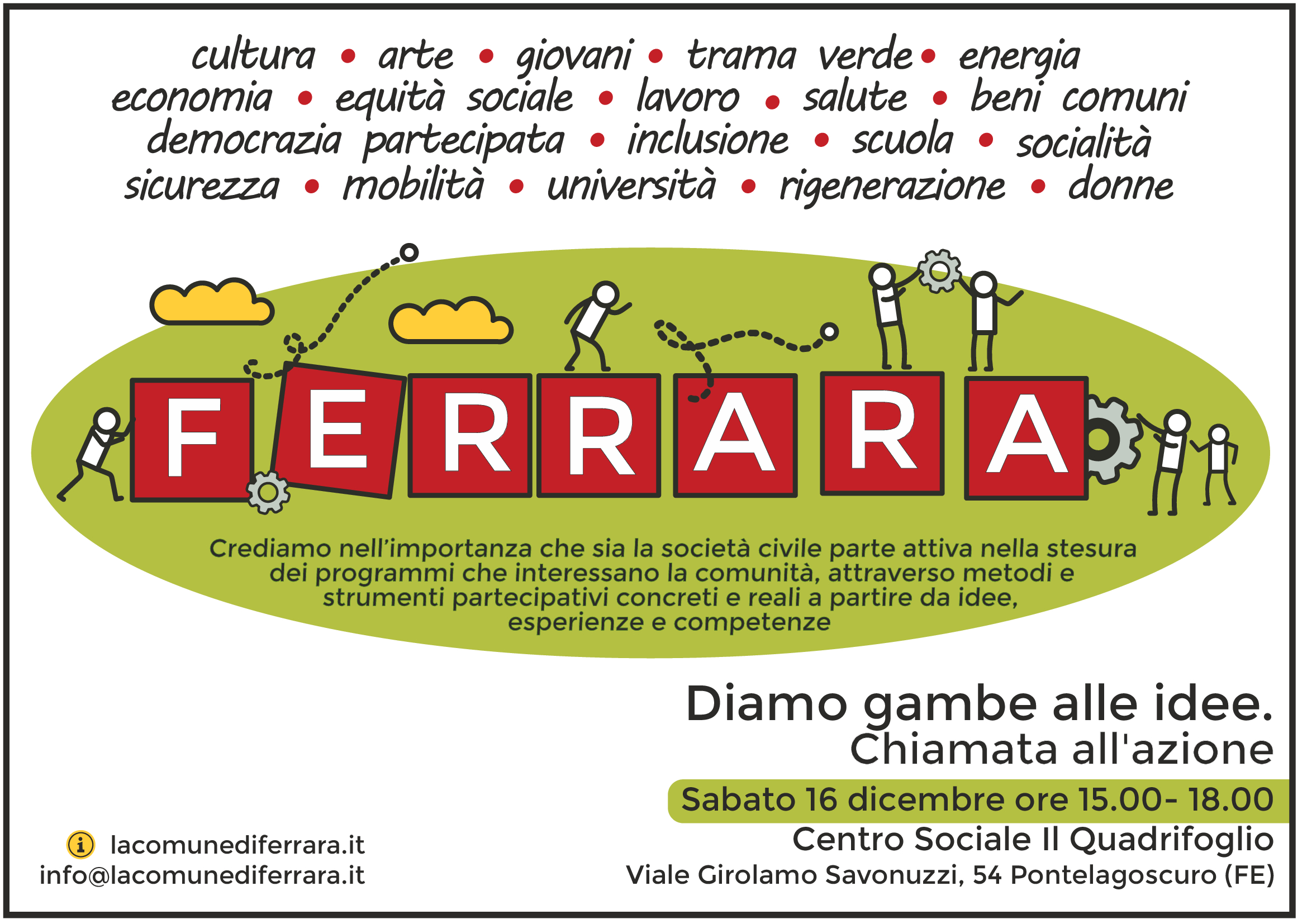 Sabato 16 dicembre presenteremo una “traccia condivisa”, il risultato delle idee, sollecitazioni, proposte espresse fino ad oggi da centinaia di cittadini e cittadine negli incontri pubblici organizzati da La Comune di Ferrara e da altri gruppi, comitati e movimenti che, in questi mesi ed anni, sono scesi in campo. L’abbiamo chiamata un “quasi programma” perché rimarrà aperto ad altri contributi e si arricchirà di nuovi contenuti nei prossimi mesi, durante la campagna elettorale. I 5 punti fondamentali, gli obiettivi prioritari, sono però già chiari.