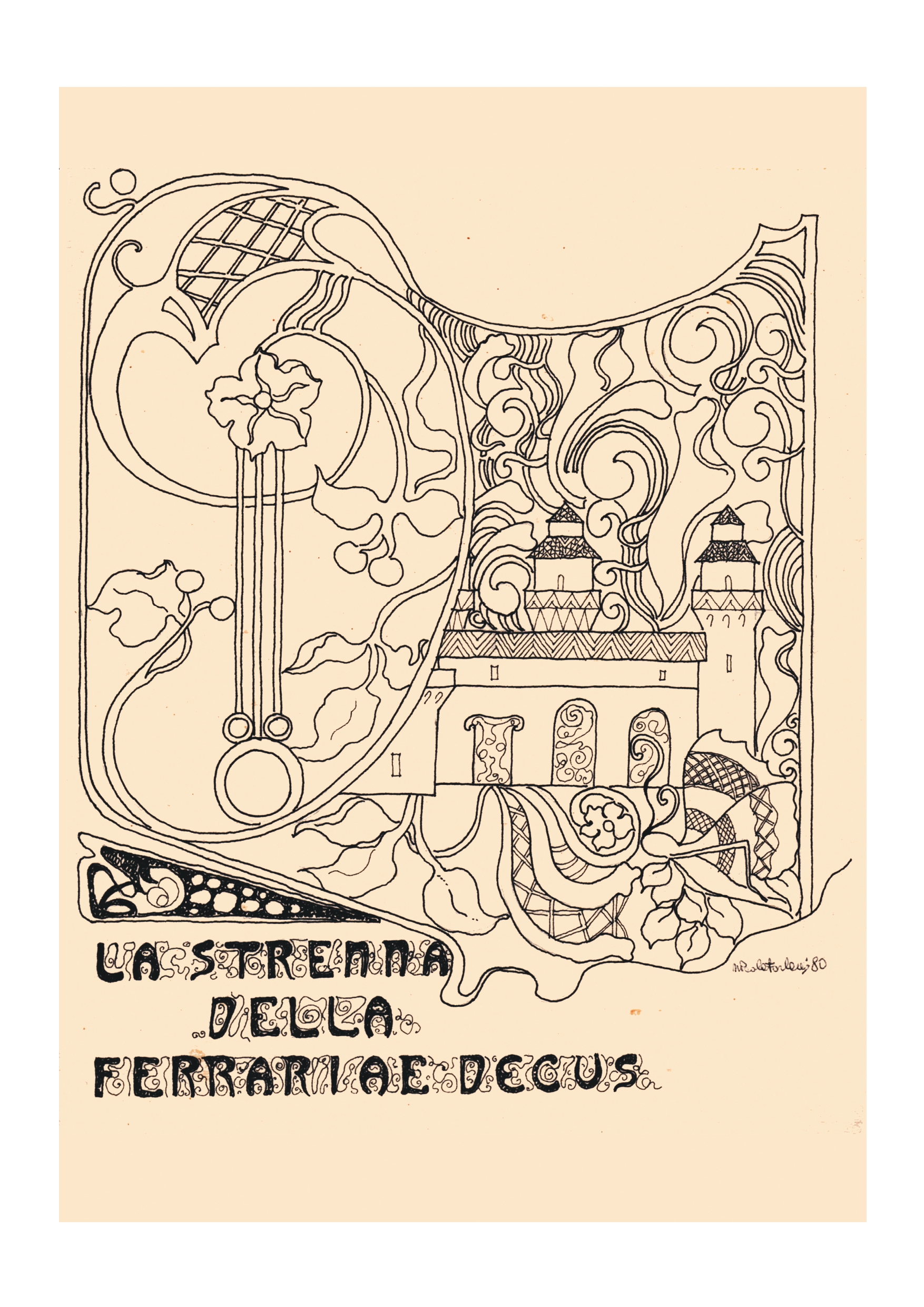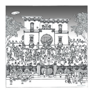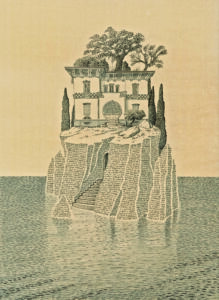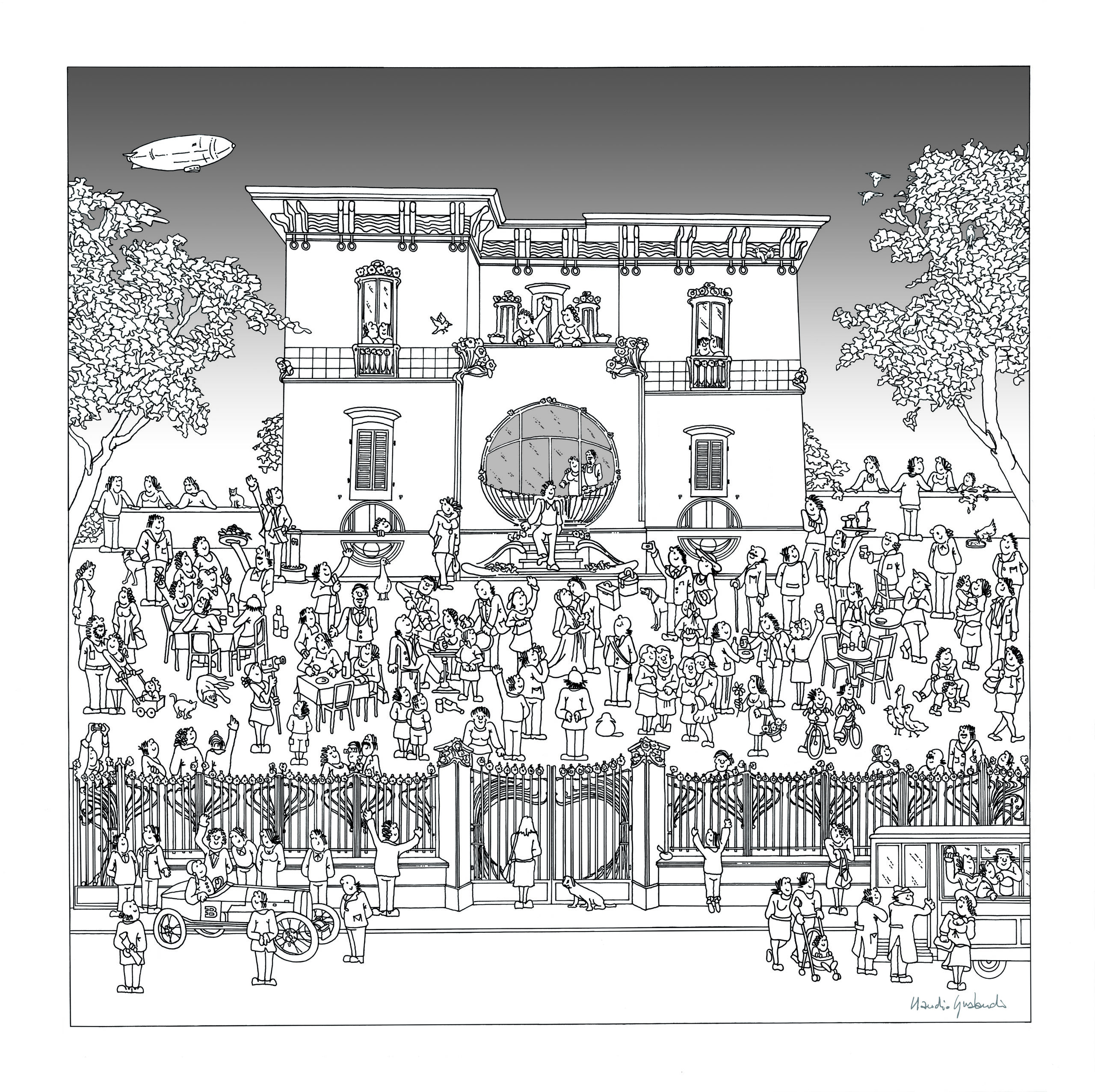 Il grafico e illustratore ferrarese Claudio Gualandi s’inventa una delle sue inconfondibili coreografie di personaggi che affollano l’edificio dentro e fuori, in memoria della storica festa inaugurale. Al contrario, l’ingegnere-artista della penna Bic, Marcello Carrà, isola letteralmente la dimora in vetta a un roccioso masso ispirato all’Isola dei Morti del pittore simbolista ottocentesco Arnold Bocklin.