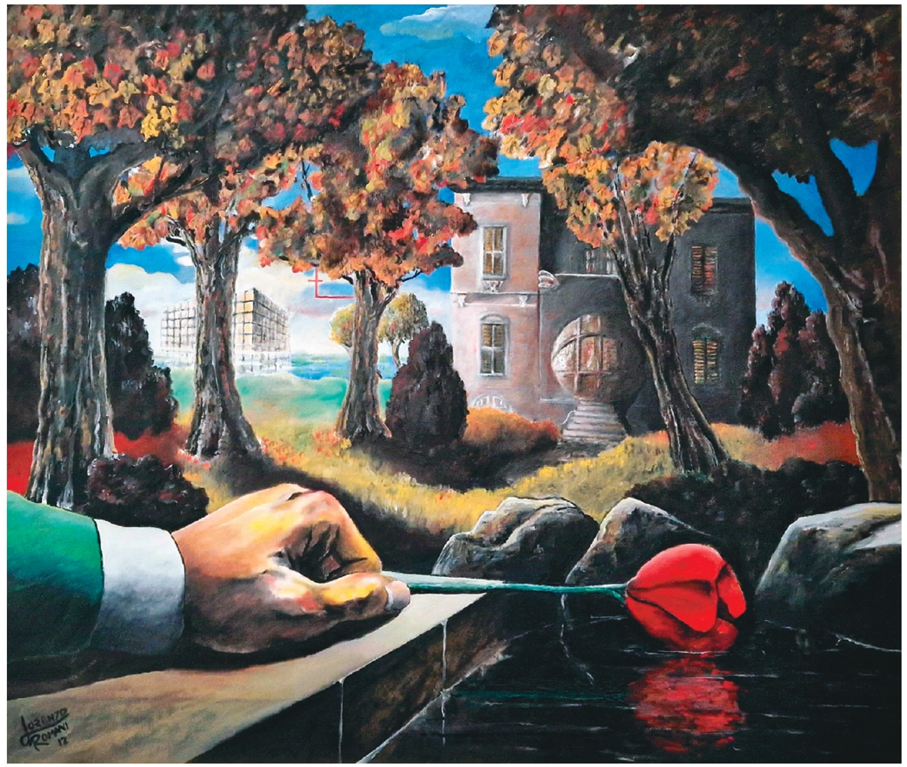 Lorenzo Romani dipinge la villa su una tela ad olio in una visione d’ispirazione noir.