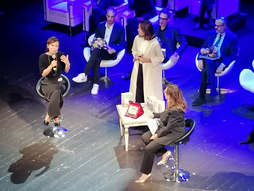 A mia volta mi trovo qui a vedere restituita in spettacolo di gala la discussione di poco fa: il teatro, bellissimo, si è riempito in pochi minuti, siamo o non siamo sulla ribalta nazionale?!? Dal palco che mi è stato assegnato ora sono io in alto a guardare giù, spettatrice di un evento perfettamente strutturato, che è a metà tra una performance artistica e una diretta tv.