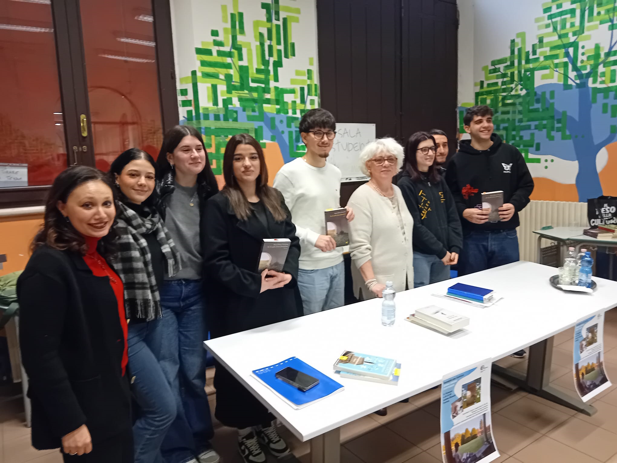 Cover: la platea degli studenti e sullo sfondo la dirigente Marianna Fornasiero mentre saluta l’autrice insieme alle docenti Carmen Ada Giarratana e Roberta Runza