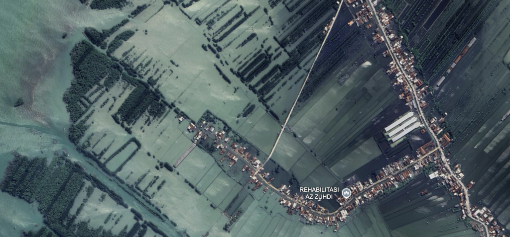 Timbulsloko e gli altri villaggi costieri dell’area di Demak si configurano come insediamenti a nastro, urbanizzazioni lineari cresciute lungo un argine che un tempo attraversava, in direzione del mare, bacini di acquacoltura e risaie. Oggi la parte più prossima al mare appare, anche a una vista zenitale, completamente coperta dall’acqua, che lascia intravedere le sfumate geometrie dei campi e i minuscoli relitti di ciò che resta, dove un tempo le ampie fasce di mangrovia proteggevano la terra dal mare.